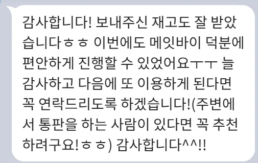 메잇바이 사무실로 물품 도착, OPP포장 완료, 배송 포장 완료 시 카카오톡 채팅으로 사진 전달